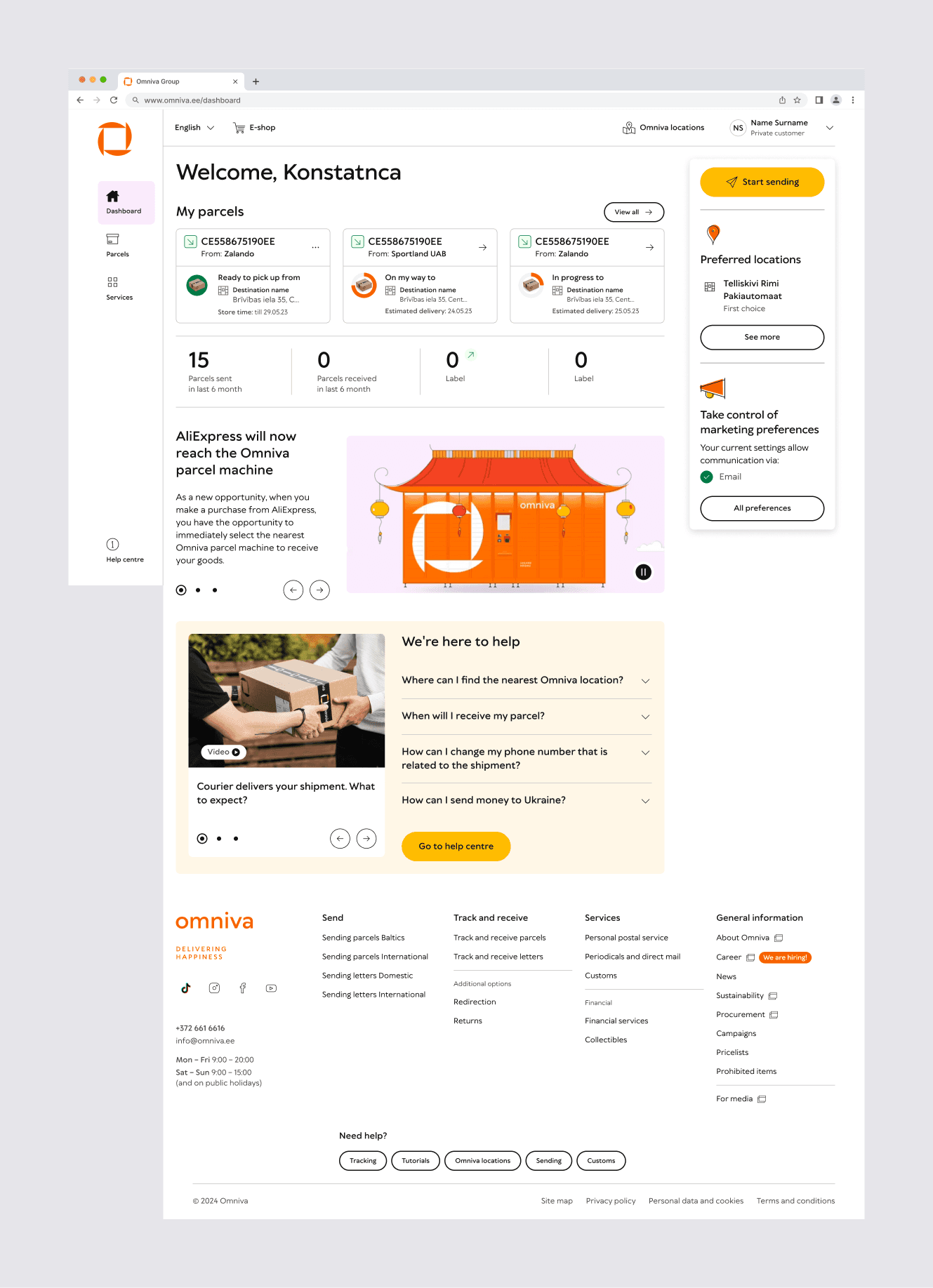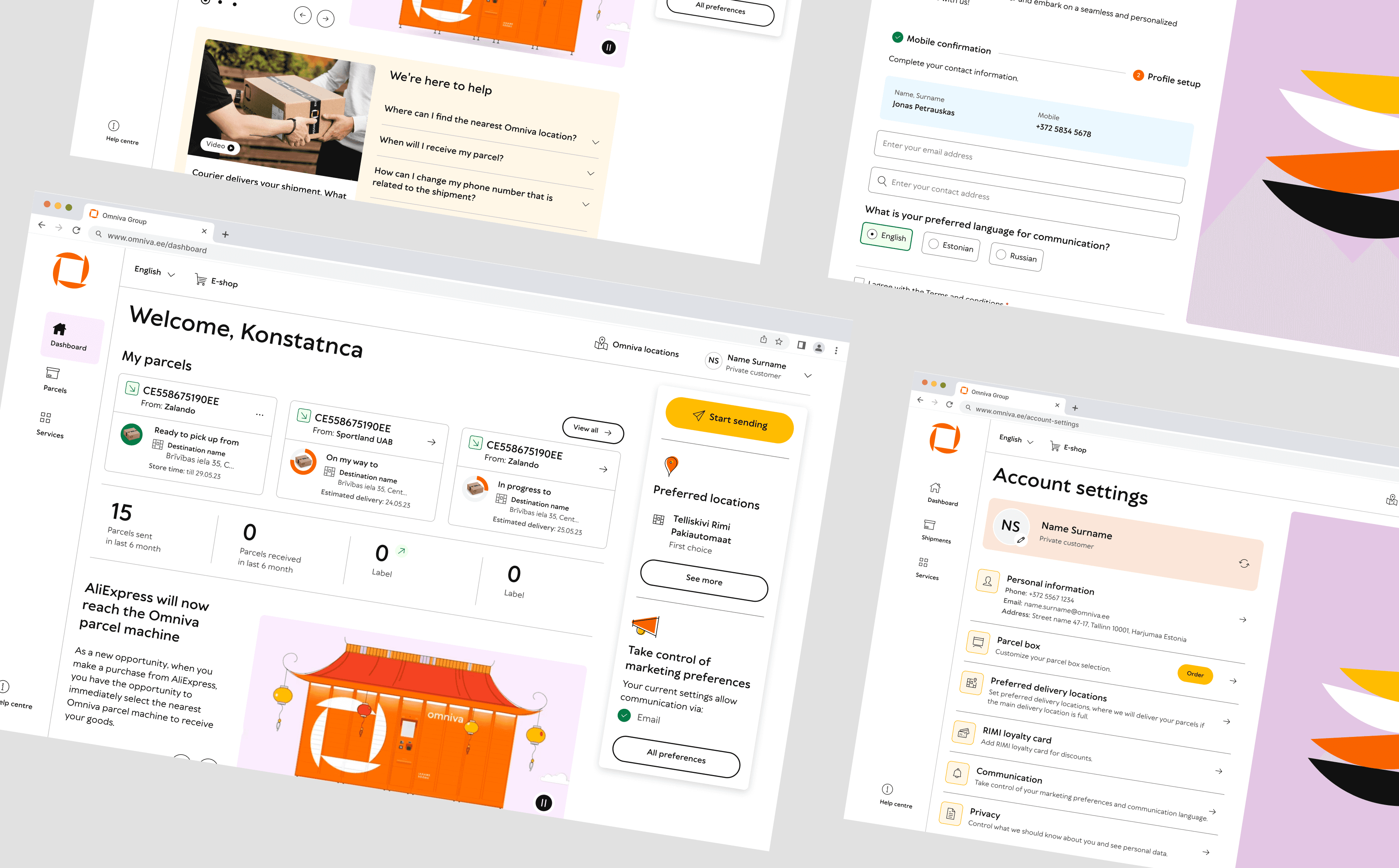 The goal was to create a user-friendly dashboard that makes important information easy to find while supporting key business actions like parcel sending. Close collaboration with teams like Picapac, Marketing, and Help Center helped ensure the most relevant data was included. Account management was also improved, giving users better control over personal settings, privacy, and delivery preferences. The entire design followed Omniva’s brand guidelines for a seamless and consistent experience.